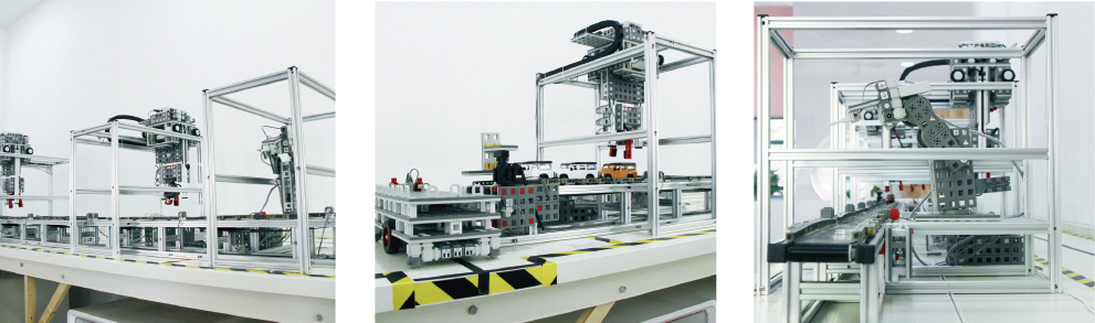 This is an automatic manufacture system consisting of CNC machining equipment, material storage and transportation equipment and computer control, etc. It possesses seven functional positions including virtual soldering, rear wheel installation, interior installation, interior integer, shell installation, finished product offline and AGV car. What’s more, 5 transmission system including underpan warehouse, rear wheel warehouse, interior warehouse, shell warehouse and main conveyor are involved in this project. Within one phase, 3 cars can be manufactured. The area of the project is 120*500cm, including showcase, power and models. The main function of the project is to teach and display. Students can copy all parts with their own thoughts instilled in, they can even create new positions of the production line, thus knowing the principle of production line.